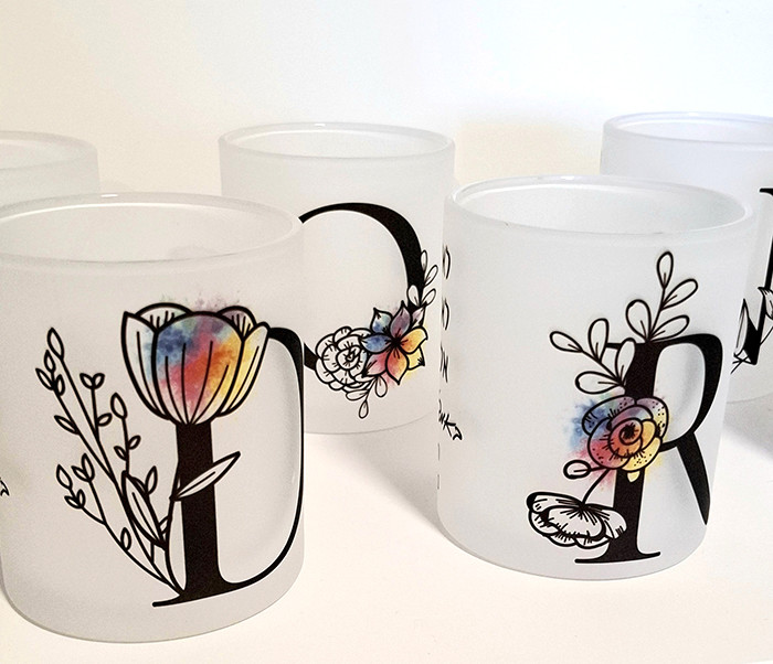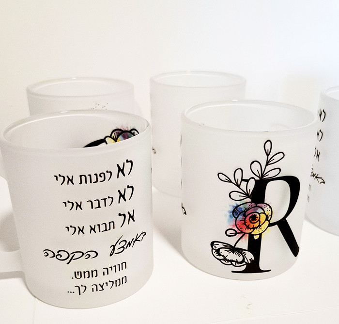 ספל זוכית חלבי מיוחדת שניתן למתג בעיצוב אישי. מתנה נהדרת לכל אירוע.
