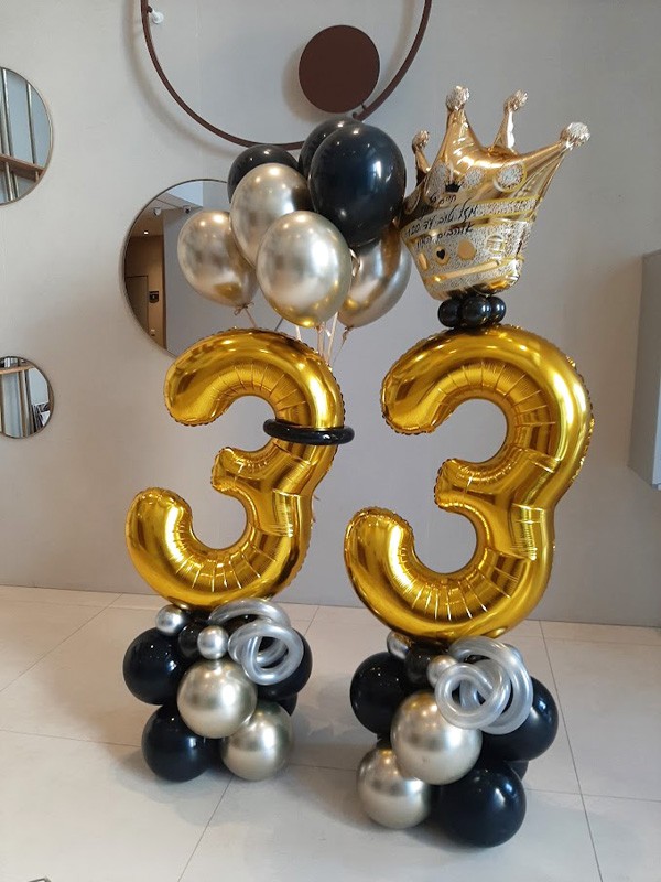 סידור בלונים גדול בשילוב שני מעמדי ספרות בגובה של 80 ס״מ עם כתר ותוספת של כיתוב ובלוני הליום. ניתן לשנות את הגוונים בהתאם.