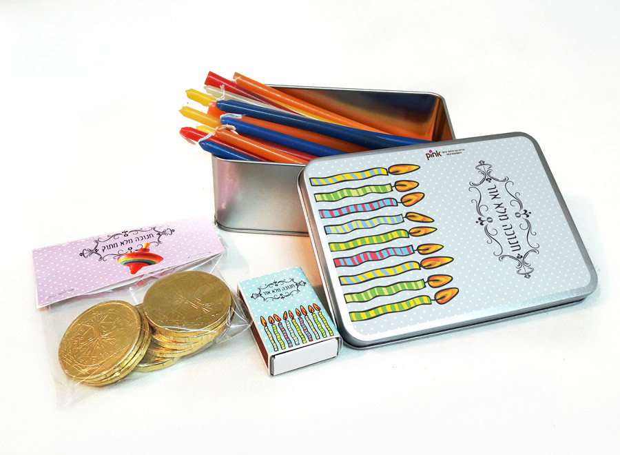 מארז מעוצב וממותג בעיצוב אישי במילוי נרותמוטבעות שוקולד. מתנה מקורית לחנוכה לעובדים, ללקוחות ולכל אירוע אחר.
