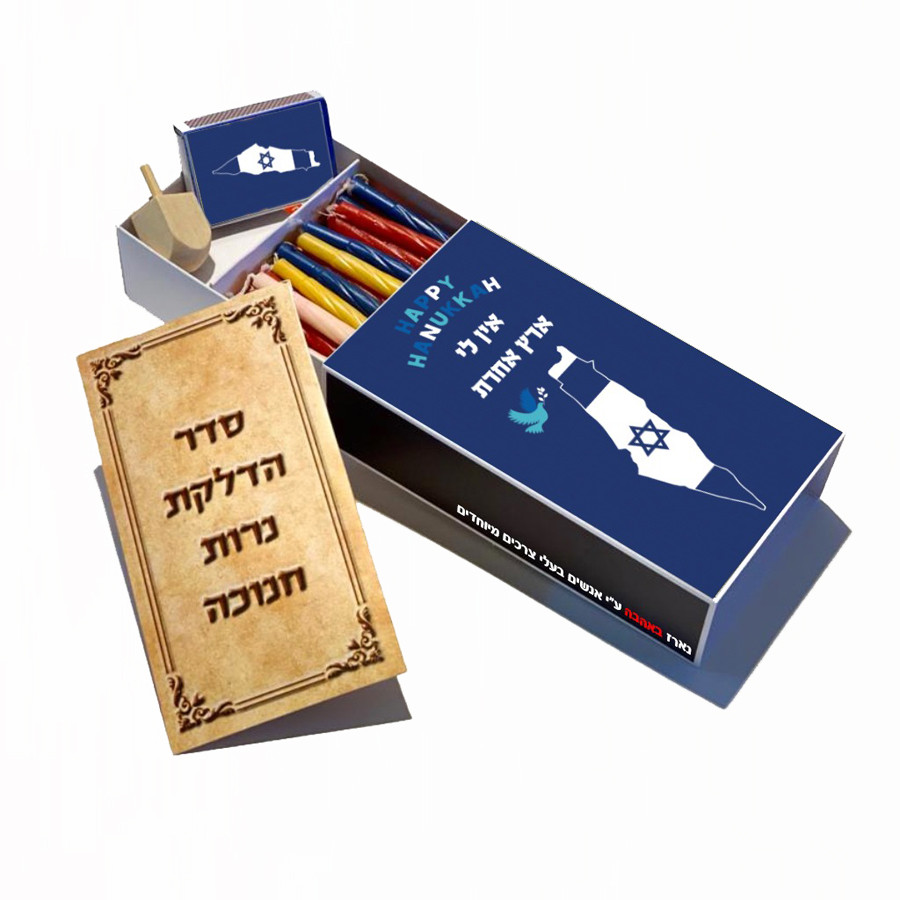 מארז קופסה עם נרות חנוכה סביבון וברכת הנרות. מתנה נהדרת לעובדים וללקוחות באירועי חג החנוכה.