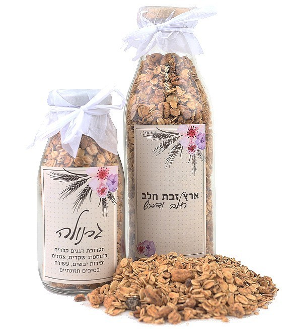 מארז מתנה נהדר לעובדים לכבוד שבועות, צנצנת דקורטיבית במילוי גרנולה שעשירה בסיבים תזונתיים ונחשבת למזון בריאות וטעים. כל צנצנת עטופה בבד חלק העליון וסרט לבן והיא סגורה היטב לשמירת הטריות.